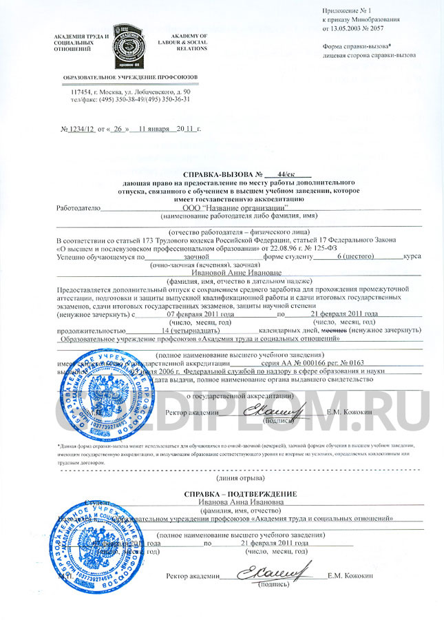 На нашем сайте Вы можете купить справку-вызов на сессию из любого ВУЗа страны. Справку используют для получения дополнительного отпуска в соответствии со 173 статьей Трудового кодекса. Справка вызова заверяется оригинальной синей гербовой печатью выбранного Вами учебного заведени и подписями ответственных лиц